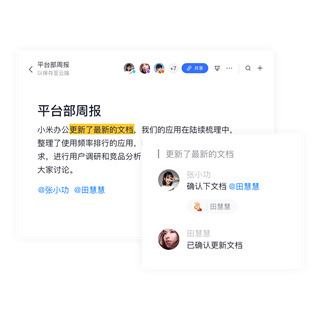 每天都在反复传文件,到底哪一版是最新?在小米办公文档可以实时协同编辑,看到的永远都是最新版。文档中还可以@同事、添加评论、插入任务列表等多种类型的内容,让在线文档成为顺畅的创作工具。