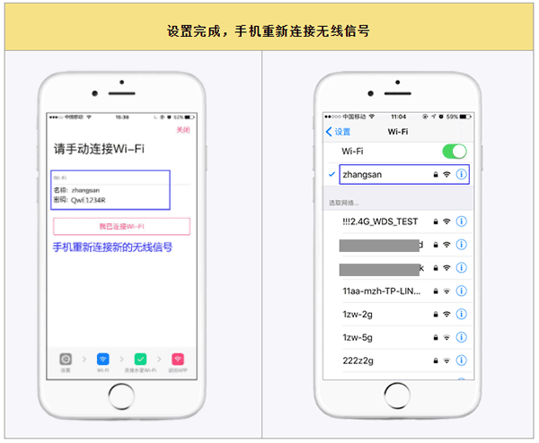 手机重新搜索新设置的无线名称,输入无线密码,连接上无线信号即可上网。