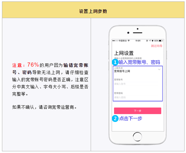 点击“确定”后跳转到如下页面,路由器会自动检测上网方式,如果检测的上网方式为“宽带拨号上网”,请在对应设置框中输入运营商提供的宽带账号和密码,点击“下一步”,如下图:
