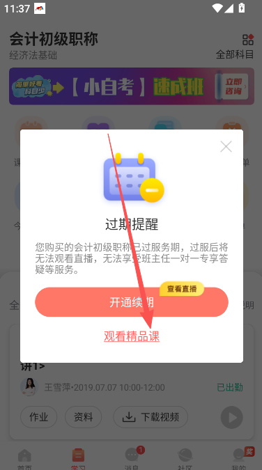 2、在弹出的提示对话框内,前往前往精品课程部分。