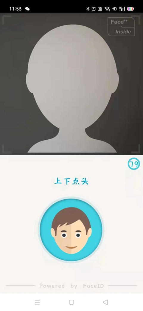 2、进入面部识别页面,调竖直拿起手机,将脸部置于拍摄框内,根据认证过程中的语音、文字提示及下方的示范在规定时间内做出相应的动作。
