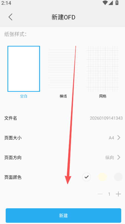 2、来到新建OFD页面,选择纸张样式设置文件名、页面大小、页面颜色、页数等参数,设置完成以后,点击底部的新建。
