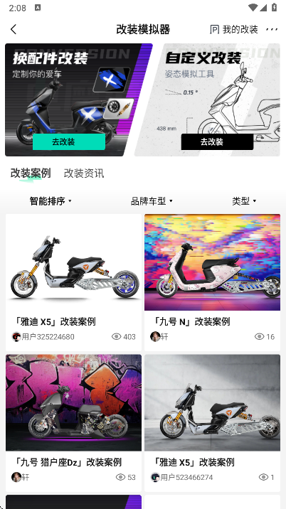 为电摩发烧友提供的虚拟电摩改装工具,包括外观改装和骑姿改装。外观改装,在实车图上对轮毂、轮胎、刹车盘、减震、涂装等进行外观改装,100%还原实车改装效果;骑姿改装,在模拟图上对车把、三星柱、减震、后平叉等参数进行调整,预览骑姿改装的效果。