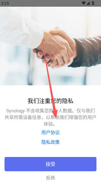 1、打开软件,点击软件的用户协议和隐私政策部分查看,之后点击接受开始使用。