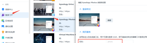 控制面板-登录门户-选择photos套件后可以自定义别名和端口