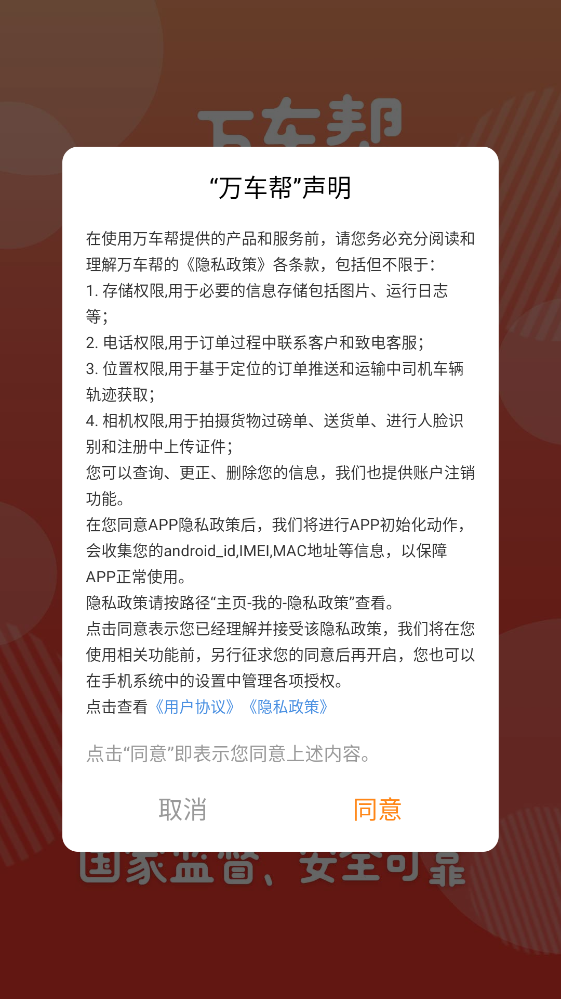 1.点击万车帮app打开之后,首先需要同意隐私政策。