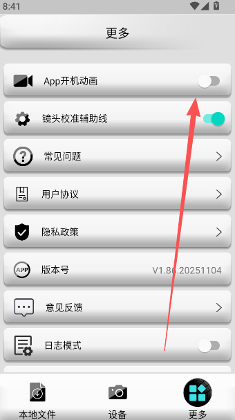 1、点击应用更多界面,选择置顶栏目列表的App开机动画开关选项,点击开启。