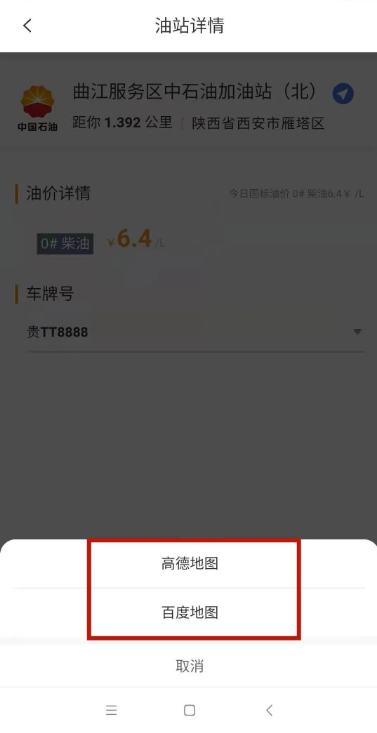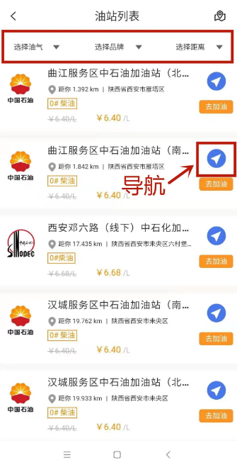 点击油站列表的右方小三角图案,跳转至地图软件,即刻开始导航。(上方可选择油气类型、油站品牌和距离。)