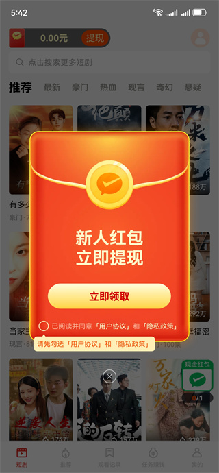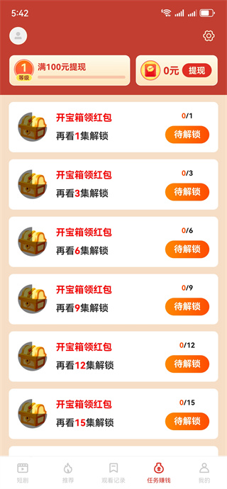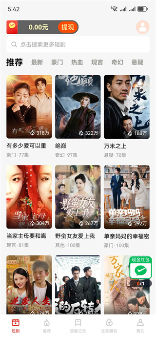 3、喜欢的短剧点开即看,完成观看任务还可以获得红包奖励;