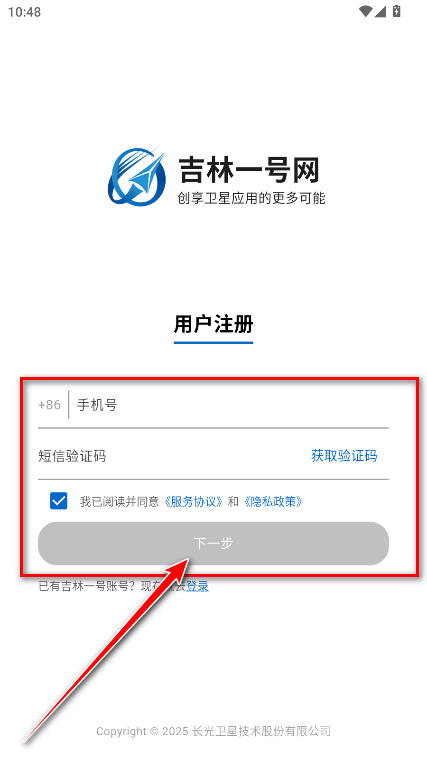 4、请输入手机号和短信验证码,然后勾选我已阅读并同意《服务协议》和《隐私政策》,再点击下一步即可。