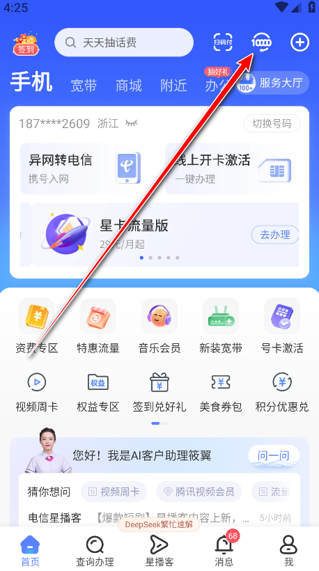 1.打开中国电信,点击右上角的客服标志。