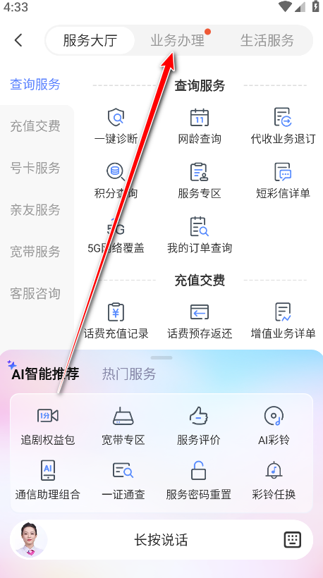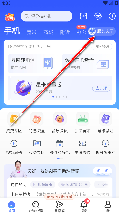 1.打开中国电信app,点击服务大厅。