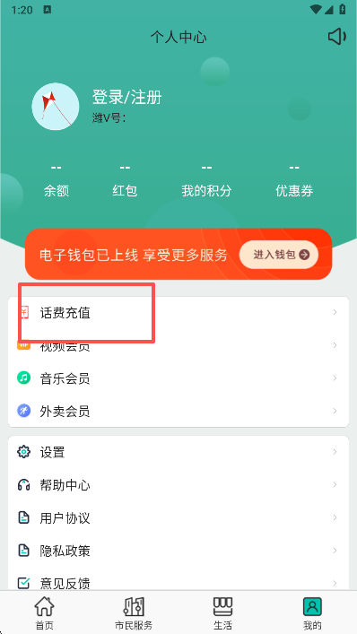 3、点击我的您可以进行话费充值的,登录等等操作
