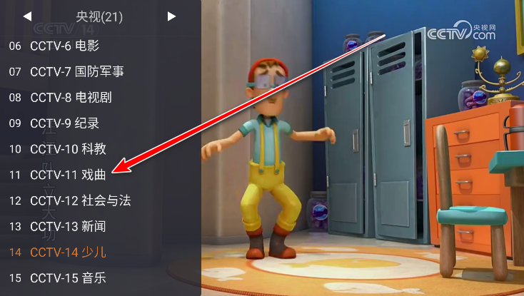 2.点击左边我们想要看的台。比如小编以点击CCTV-11戏曲为例。