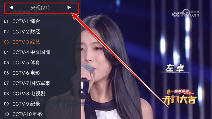 2.先点击手机屏幕,然后点击上方的向左向右的按钮,即可切换央视、央视数字、卫视等等频道。