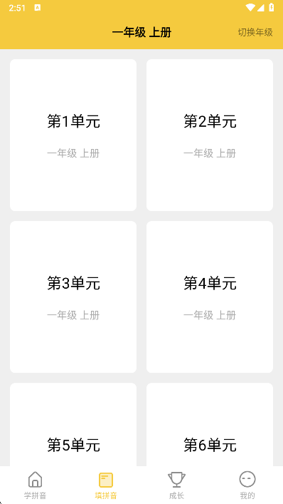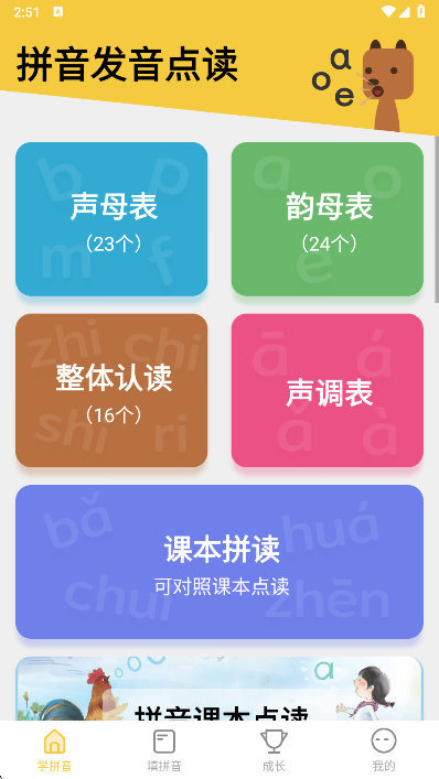 1、下载安装后打开,您可以浏览到学拼音,填拼音,成长,个人中心等版块