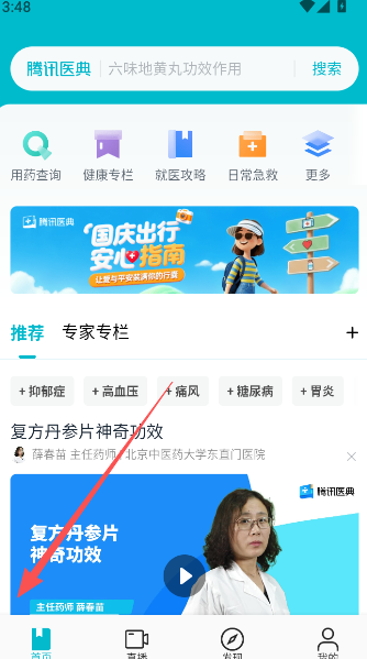 1、首页, 为用户提供用药查询、健康专栏、就医攻略、日常急救等医疗知识。