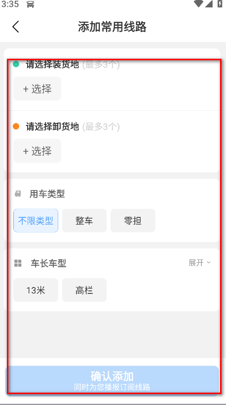 3.请按照软件要求填写装货地、卸货地、用车类型、车长类型等,最后点击确认添加即可。