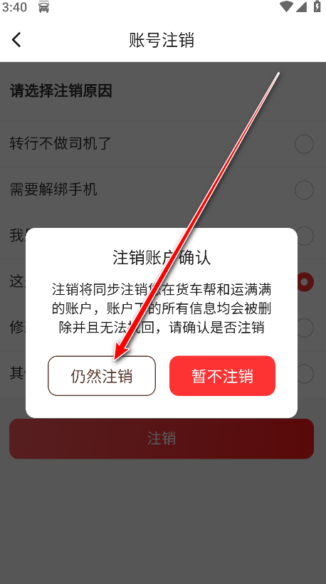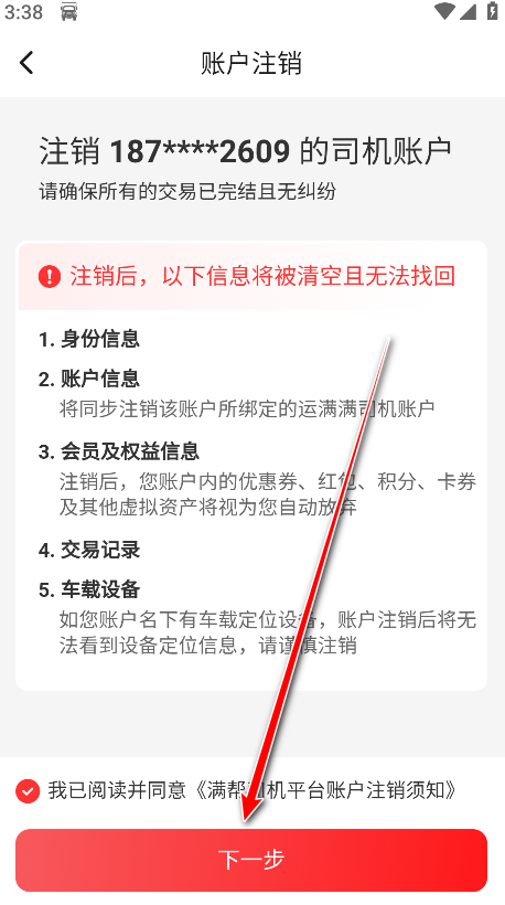 4.勾选我已阅读并同意《满帮司机平台账户注销须知》,再点击下一步。
