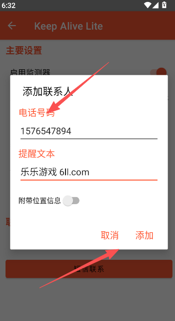 4、在短信联系内容编辑区域,输入要添加的联系人电话号码以及提醒文本部分,附带位置信息可以选择开启也可以不开启。