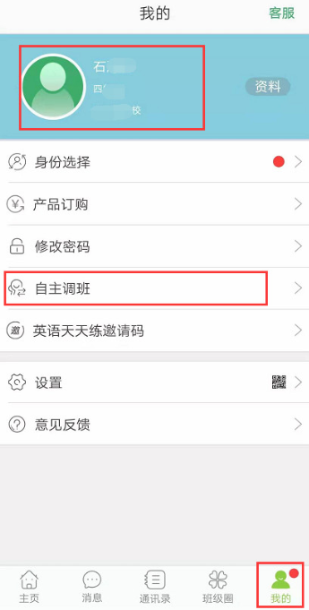 2、如果不是孩子目前就读的学校和班级,则需要进行自主调班,点击“我的”—“自主调班”