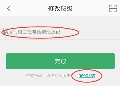 输入班级码或者班主任手机号,即可进行调班,如果按照以上步骤,仍不能正常调班,可拨打客服热线:9600159,进行调班