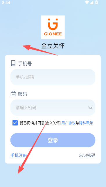 1、首次进入请先注册,或是登录使用原有金立手表app的用户账户进入。