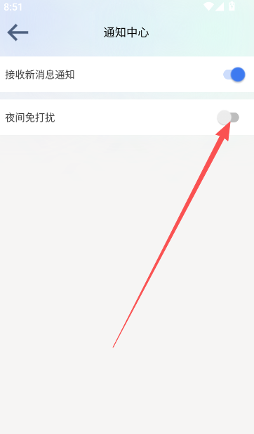 2、来到通知中心以后,点击是否接受新消息提示或是夜间免打扰的提示,选择开关按钮完成设置。