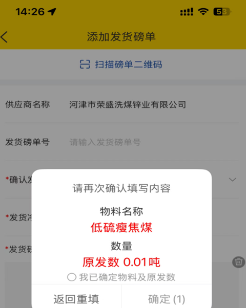 三、核对收货物料信息,输入原发数量以及原发日期;