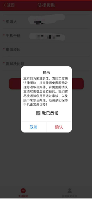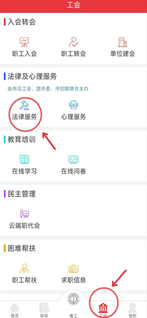 1、从软件底部导航栏点击“工会”栏目便可找到“法律及心理服务”,点击“法律服务”进入即可。