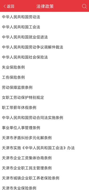3、法律政策主要包含了《中华人民共和国劳动法》、《中华人民共和国合同法》、《中华人民共和国工会法》等政策文件,职工会员可以通过此模块查询对应的法律条款,以备使用。