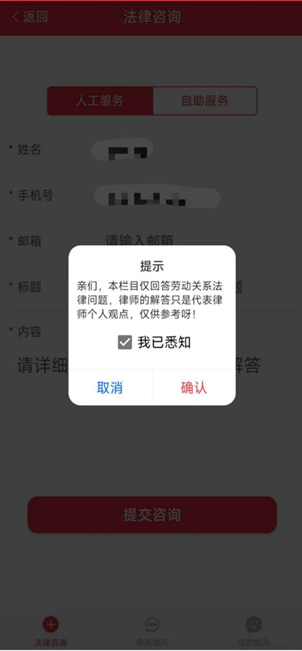 4、法律咨询的功能主要有2个,一是可以通过人工服务向律师提交相关法律问题的咨询。