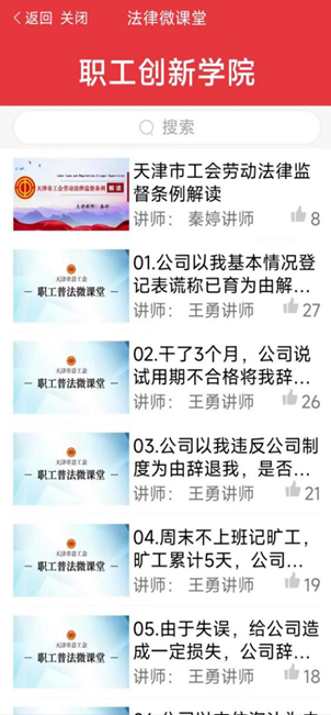 5、法律微课堂模块为职工会员提供了关于法律知识的视频普及,职工会员可以通过此模块自助学习法律知识。