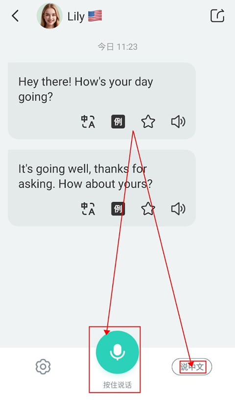 用户在开始学习后,用户就可以开始和AI对话啦,用户也可以使用中文和AI对话,点击右边的中文即可,但是小编建议用英文哦,这样可以提高您的口语能力。