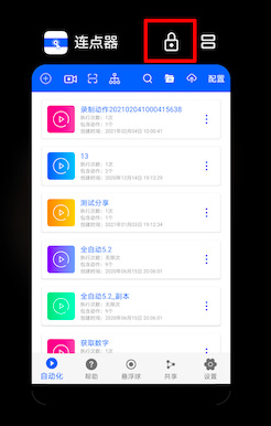 - 部分小米手机:打开任务栏——长按“连点器”——即可出现锁的图标;