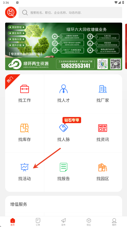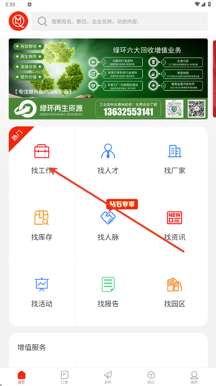4、点击发布按钮后,您可以选择要发布的信息类型(如发布订单、发布招聘、发布产品、厂房转让等)
