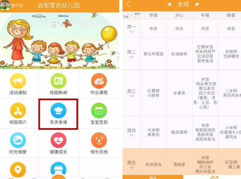 6、【天天食谱】每周食谱更新在天天食谱内。