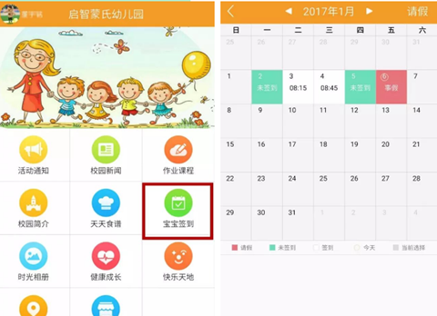 7、【宝宝签到】及时查看宝宝的出勤记录。每月全勤宝宝会以刷卡或者扫一扫签到为准,请家长们务必接送时刷卡或者手机签到。