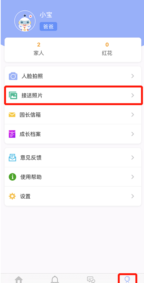 3、进入我的---接送照片---选择要录入的家长一位家长可以为邀请过的多个家庭成员录入人脸;