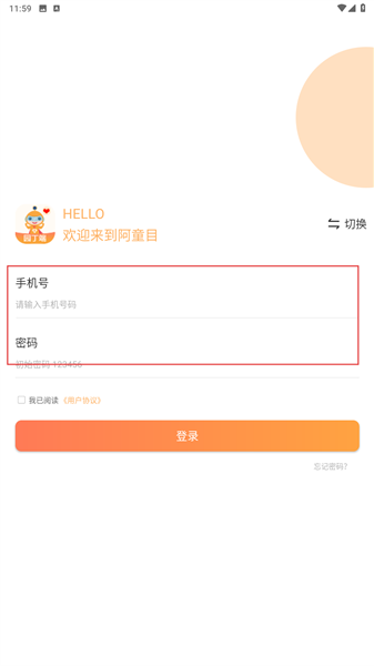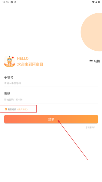 2、在登录页,输入手机号和账户密码,勾选下方用户协议点击登录。