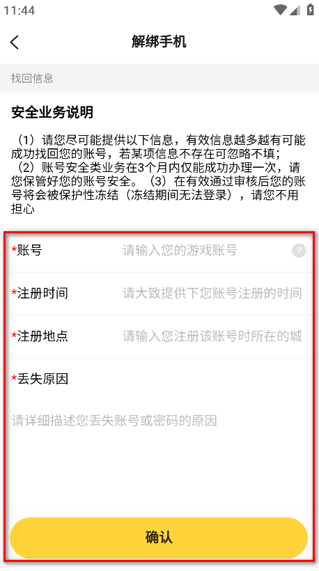 5.请输入您的游戏账号、注册时间、注册地点、丢失原因,再点击确认。然后按照软件的提示解绑即可。