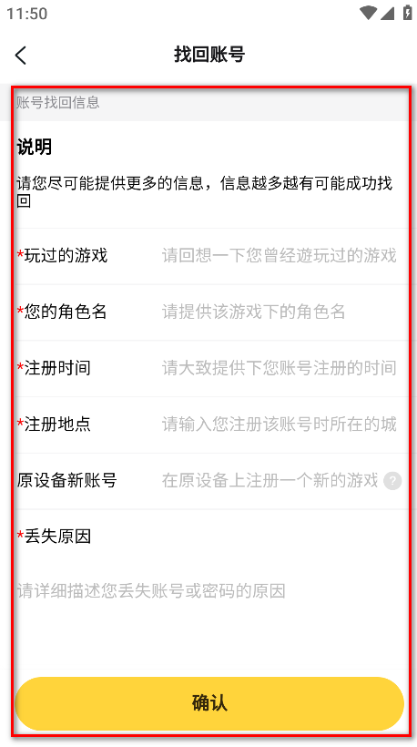 5.请详细填写以下的账号找回相关信息,然后点击确认。再按照软件的提示操作即可找回账号。