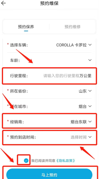 3、填写爱车公里数、选择经销商、预约到店时间。