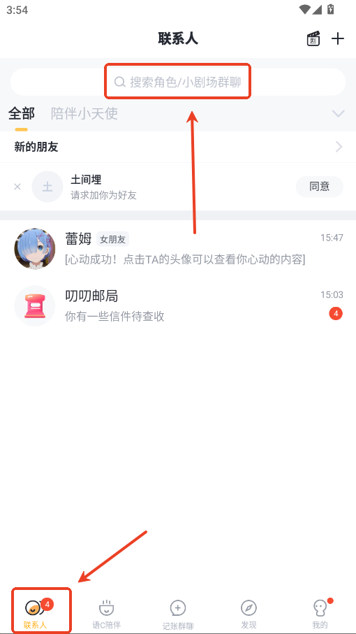 1.在联系人中搜索你要加的好友名字。