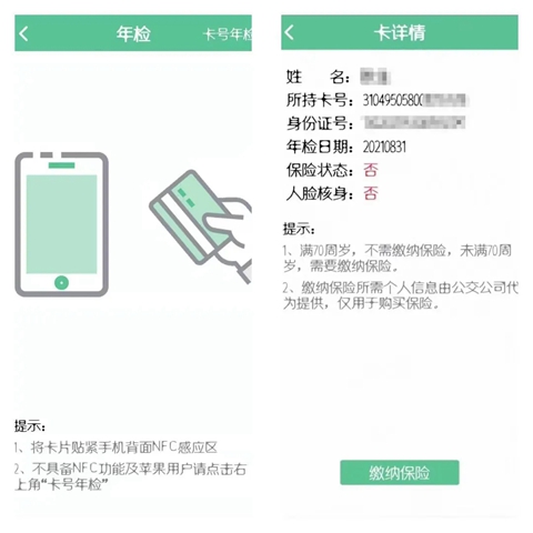 第一步:检测卡片是否需要年检1、已到年检日期打开唐山行APP,点击【老年卡年检】按钮,阅读《年检须知》后进入“年检”界面,将敬老卡紧贴在手机NFC感应区域(在手机设置中开启该功能),感应成功后跳转到“卡详情”界面,认真核实本人姓名、所持卡号、身份证号、年检日期等信息。