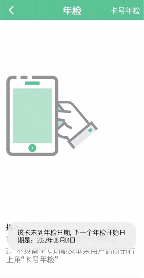 使用手机NFC功能读卡后页面提示未到年检日期的,无需年检。