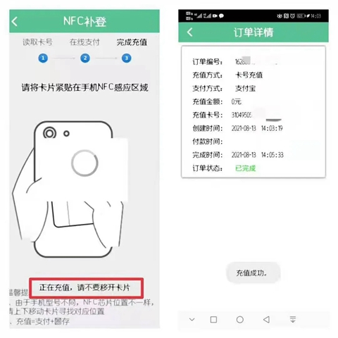 付款成功后,可以使用线下补登机进行补登;也可以使用具有NFC功能的手机进行补登,待充值金额写入卡内后方可乘车使用。