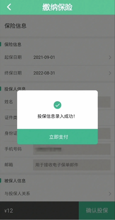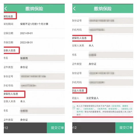 2、投保人仔细检查并确认保险信息、投保人信息、被保险人信息和受益人信息,逐条阅读《投保须知、健康告知》、《保险条款》、《免责声明、参保说明》、《被保险人同意声明》等重要事项,并点击【我已阅读】按钮,返回“缴纳保险”后在“本人已了解接受保险公司关于本产品的《投保须知、健康告知》、《保险条款》、《免责声明、参保说明》、《被保险人同意声明》等在内的重要事项,并知晓保险费应由投保人本人账户支付”前面方框内划“√”,点击【提交订单】按钮,在查看弹出的“投保信息录入成功!”提示框后点击【立即支付】按钮,支付老年人乘客意外伤害保险相应的费用。