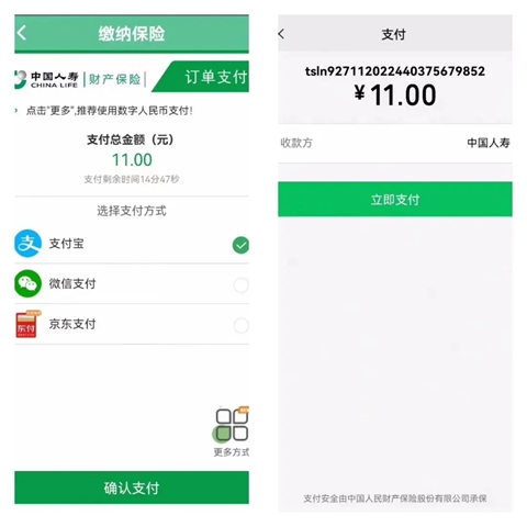 3、订单提交成功后,在“收银台”界面选择支付方式(支付宝、微信支付和京东支付三种支付方式)进入“支付”页面,点击【立即支付】按钮,在“国寿收银台”界面显示出单成功,点击【返回业务系统】按钮进入“人脸核身”界面。