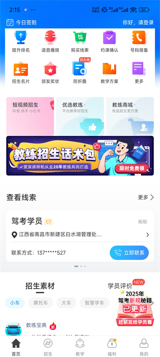 【驾校招生】 教练入驻教练宝典,可以随时收到从驾考宝典来咨询学车的学员信息,驾考宝典拥有千万学员,真正做到帮驾校解决招生的问题。